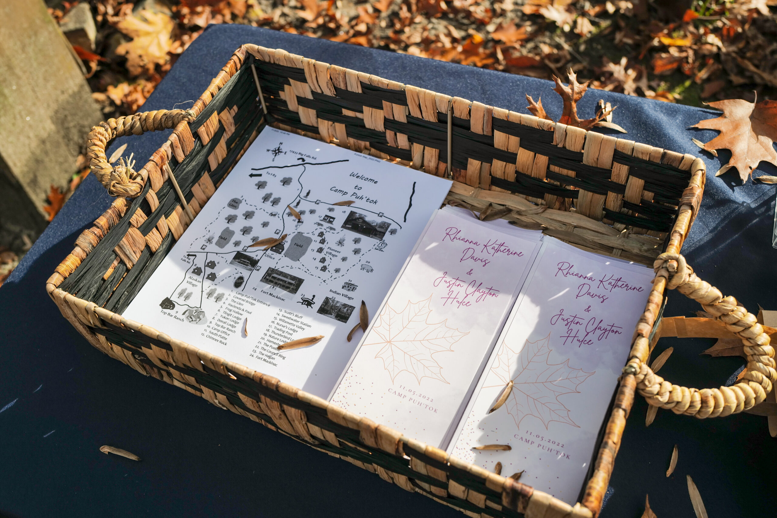 rectangular wicker basket with maps of campground wedding venue and tri-fold wedding programs